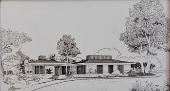 The Robert & Lucille Melcher Residence: A 1965 Pavilion style Mid-Century Modern by Los Angeles modernist architect Peter Munselle, A.I.A.. 4 bedrooms + 3 bathrooms. Formal entry. Center hall floor plan. Expansive open living & dining room surrounded by eight-foot-high walls of glass opening to front & rear grounds for seamless indoor-outdoor flow. Living room with classic Mid-Century slump stone fireplace and built-in bookcase & cabinetry. Formal dining area with butler’s pantry & built-in marble topped credenza. Both living room and formal dining area are crowned with a magnificent and architecturally significant four-sided cross-beamed Pavilion style ceiling & skylight. Chef’s gourmet kitchen with original Mid-Century cabinetry in exceptional condition, sit-down recipe desk and breakfast bar overlooking den/family room. The den/family room features custom built-in cabinetry & bookcase and overlooks an enclosed spa & covered outdoor dining area. The primary suite faces the front grounds and features a dual-bath with shared shower. A small private office is located off the master suite. There are three additional bedrooms, two with connecting bath and one ensuite. All bedrooms and most public rooms have exceptionally high ceilings and either view or open to front & rear grounds or private patios. Rear yard with room for pool & spa. Prime corner lot located near the end of a cul-de-sac. Minutes to the Getty, Santa Monica and West Los Angeles as well as U.C.L.A., Westwood, Century City and Beverly Hills. Close to some of Los Angeles’ most coveted public & private schools.